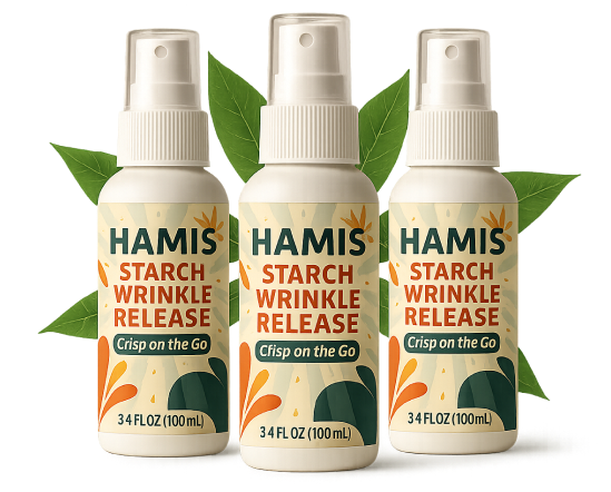 With Hamis Starch Wrinkle Release, you can smooth, refresh, and revive your outfits in seconds. Made from natural cassava starch and aloe vera, it’s the smarter way to stay crisp and confident at home or on the go.